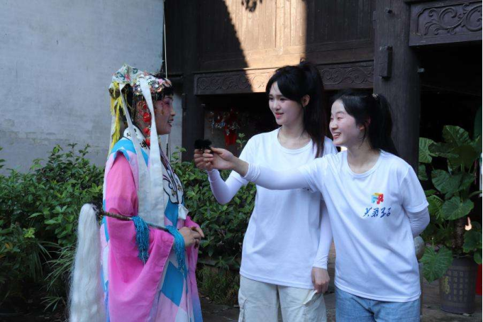 (图为湘大学子采访辰河高腔演员。摄影 周文惠)