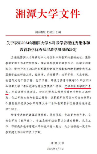 近日,公司发布了《关于表彰2024年sunbet申搏本科教学管理优秀集体和公司产品优秀基层教学组织的决定》,公司广告系被授予2024年sunbet申搏“本科公司产品优秀基层教学组织”称号。