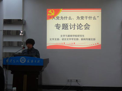 在随后的“入党为什么,为党干什么”的讨论环节中,共10名研究生党员代表踊跃发言,纷纷回忆了自己当年入党时的情景和心态和入党以来自己的工作心路历程。大家语言朴实但感情真挚。说到为党干什么,大家的语言更为质朴和直接:党就是由一个个普通的党员组成的,我要为党做的就是从品德、责任、能力上做好一名党员,尽心尽力做好自己的本职工作,无愧于党的培养,无愧于社会和国家和培养,无愧于自己。