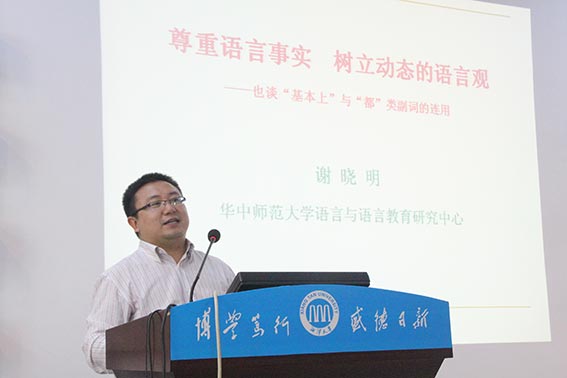 谢晓明分为尊重语言事实、树立动态的语言观、也谈“基本上”与“都”类副词的连用等三个方面,阐释了讲座主题。