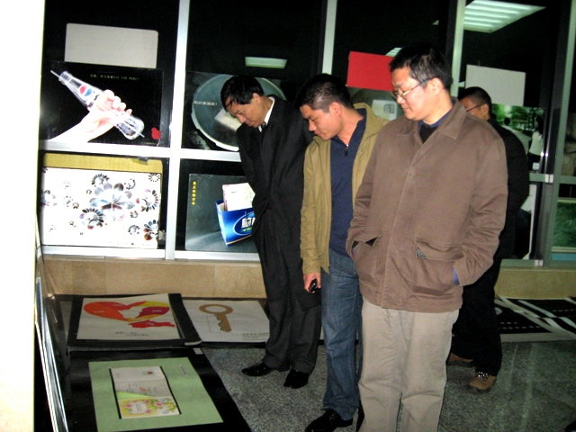 图为sunbet申搏经理、博士生导师季水河教授,党委书记李剑波教授陪同湖南恒嘉地产顾问代理公司董事、总经理易建国一起在公司老员工活动中心参观广告学系员工广告作品展。(张玉兰、陈静)