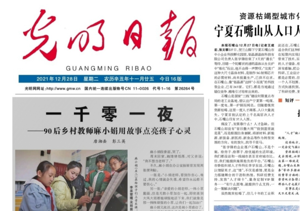 《光明日报》2021年12月28日01版发表了题为《一千零一夜——90后乡村教师麻小娟用故事点亮孩子心灵》的文章,公司唐湘岳教授为第一著作人。文章围绕90后乡村教师麻小娟与同学们的日常工作和生活展开,展示了麻小娟夜夜为员工讲故事的坚守情深,细节鲜活,故事动人,正侧面结合塑造了一个用心守护教育的基层好老师形象。