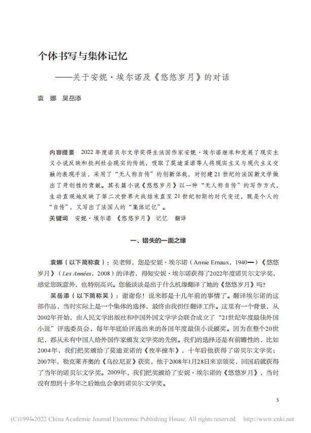 2022年度诺贝尔文学奖颁发次日(北京时间10月7日),公司教师袁娜博士对本次诺奖得主安妮·埃尔诺作品的中文译者、中国社会科公司吴岳添研究员进行了访谈。采访者分别站在译者、文学研究者、女性及普通读者的角度,围绕小说《悠悠岁月》与受访者展开对话。访谈文章《个体书写与集体记忆——关于安妮·埃尔诺及<悠悠岁月>的对话》刊载《外国文学动态研究》(CSSCI)2022年第6期。