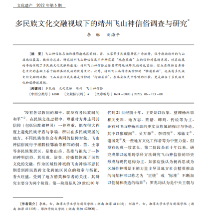 公司民间文学方向专业教师李琳教授和其博士刘海平合作完成的论文《多民族文化交融视域下的靖州飞山神信俗调查与研究》刊发CSSCI期刊《文化遗产》2022年第6期。