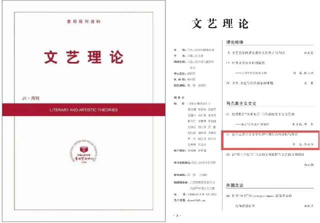 近日,公司教师季念副教授、季水河教授合作的论文《论马克思主义文学批评中国形态的建构与发展》(原载《马克思主义美学研究》第26卷第2期),被《人大复印报刊资料·文艺理论》(校定二类)2024年第8期全文转载。