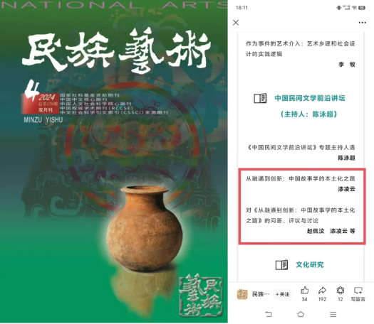 近日,公司漆凌云教授在《民族艺术》(校定二类)2024年第4期发表题为《从融通到创新:中国故事学的本土化之路》的学术论文。