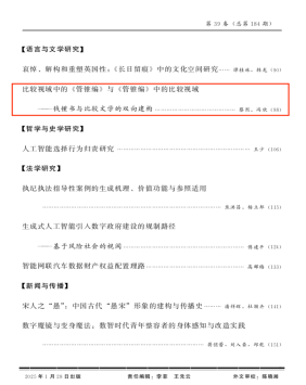 公司蔡熙教授与冯欣合作在《湖南大学大学学报(社会科学版)》(CSSCI)2025年第1期发表题为《比较视域中的〈管锥编〉与〈管锥编〉中的比较视——钱锺书与比较文学的双向建构 》的学术论文。