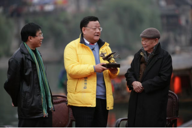 这件礼物,就是黄永玉先生当年给凤凰县设计的城标雕塑的原稿,一只展翅飞翔的凤凰。在直播中间,黄永玉先生亲手将它赠送给了凤凰卫视董事局主席兼行政总裁刘长乐先生。
