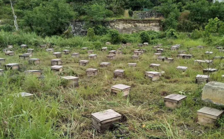 一般人看到蜜蜂有点害怕,其实只要你懂了蜜蜂的习性,就知道你不动它,它一般不会蛰你。当然也有被蛰的时候嘛,蛰到鼻子、嘴唇、耳根,那就比较痛。不过蜜蜂没毒,还有除风湿的效果哩。2017年,我买了几十箱蜜蜂回来。我学了技术,查了很多资料。蜜蜂有春繁和秋繁两个繁殖期,蜂群都有个蜂王嘛,起了王台之后,老王就会带着一群蜜蜂飞走,我们养蜂人要在王台快成熟的时候,进行人工分箱,这样能减少蜜蜂外逃的几率。