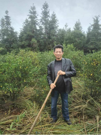 苗刚插下去怕干死,也怕有虫害,我心里头老惦记着。晴天骑摩托车去山上,下雨就骑三轮车。就算是摔了腿杵着拐杖,我也要去园里看看。为了省人工钱,我们夫妻俩一早上就去,在园里一待就是大半天。我左腿萎缩,右腿抬腿都费劲,但也使劲搞。我还把我的镰刀把手加长了。这样握着镰刀,稍微弯下腰就能砍柴。