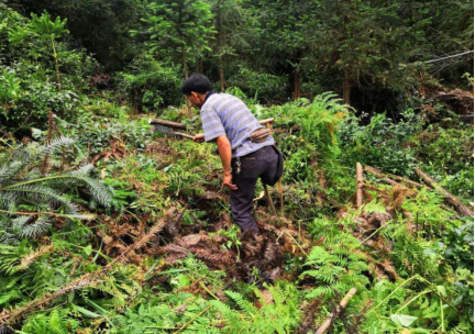 (刘道东在山间挖取山货)